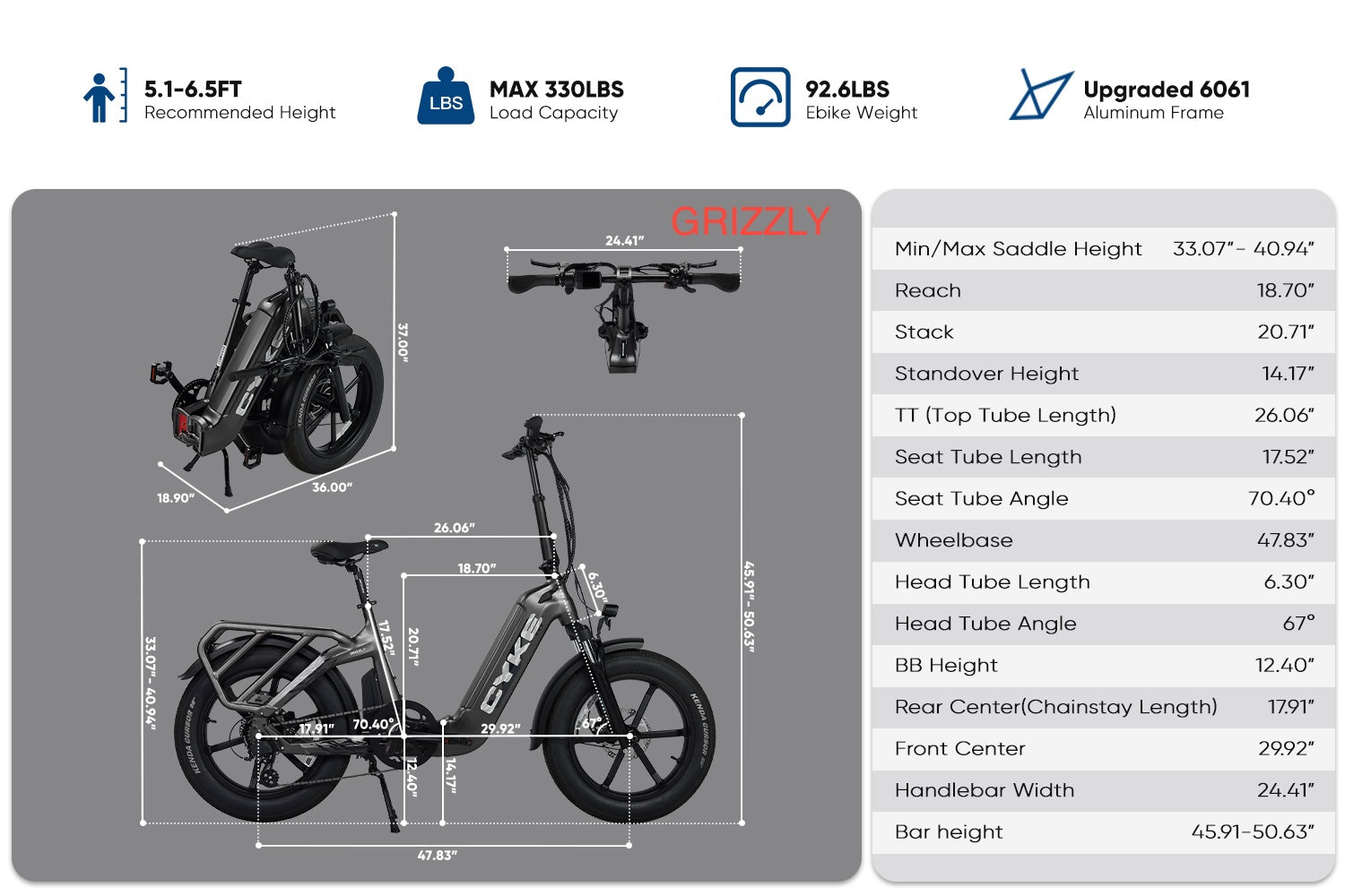 The Cyke Family Series Grizzly Foldable Electric Bike is a powerful, space-saving electric bike designed for riders who want heavy-duty performance without sacrificing portability. Built on a reinforced aerospace-grade 6061 aluminum alloy foldable frame, the Grizzly supports an impressive 450 lb load capacity while folding down for easy storage in apartments, garages, or vehicle trunks.
