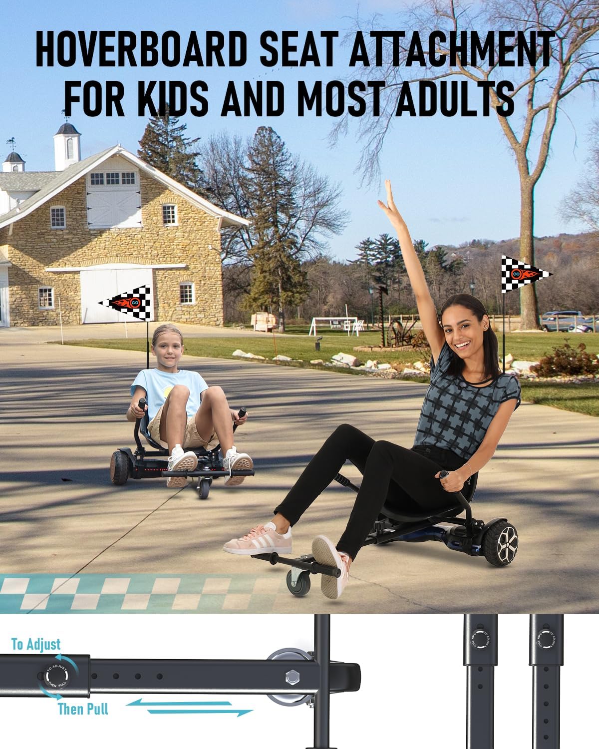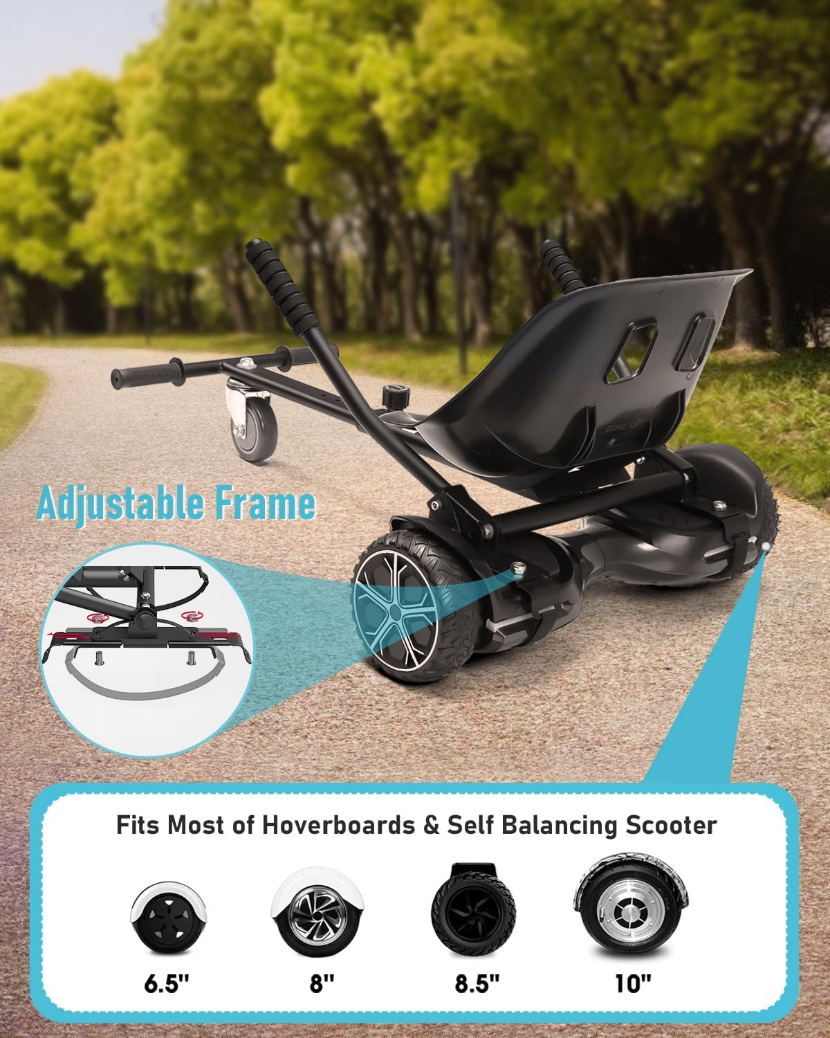 The Gyroor K1 Self Balancing Scooter Seat Attachment is a versatile go-kart conversion kit designed to transform 6.5'' to 10'' self-balancing scooters into an exciting seated riding experience. Built with an adjustable frame length, the K1 easily accommodates kids, teens, and adults, delivering smooth control and dynamic maneuverability.